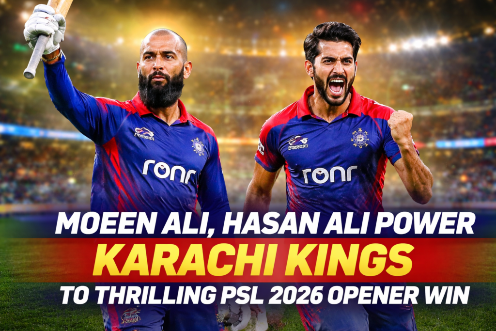 AI Image created • Karachi Kings celebrate PSL 2026 win The 2026 season of the Pakistan Super League got off to an electrifying start as Karachi Kings registered a hard-fought victory over Quetta Gladiators in their opening clash at the iconic Gaddafi Stadium on Friday, March 27. In a contest that ebbed and flowed across both innings, it was the all-round brilliance of Moeen Ali and the fiery finishing burst from Hasan Ali that ultimately tilted the balance in favor of Karachi, sealing a 14-run win and setting the tone for what promises to be a thrilling PSL campaign. The match began with Quetta Gladiators captain Saud Shakeel winning the toss and opting to field first, a decision influenced by the expectation of dew later in the evening. Early signs suggested that the move might pay off, as Karachi Kings suffered an immediate setback with the dismissal of Muhammad Waseem for a three-ball duck. The early wicket injected energy into the Gladiators’ camp, and for a brief moment, it appeared that Karachi might struggle to find momentum. However, what followed was a counterattack that quickly shifted the narrative. Salman Agha walked in at number three and immediately imposed himself on the game. Partnering with the experienced David Warner, Agha took an aggressive approach, targeting the Gladiators’ bowlers with calculated intent. Warner, in particular, looked in sublime touch, smashing four consecutive boundaries off Alzarri Joseph in a single over, sending a strong message about Karachi’s attacking mindset. Agha matched Warner’s aggression stroke for stroke, taking on Ahmed Daniyal with three successive fours, including a cheeky scoop that delighted the crowd. Yet, just as the partnership was beginning to look ominous, Daniyal struck back, trapping Agha leg-before on the very next delivery. It was a moment that encapsulated the unpredictability of T20 cricket—momentum can shift in an instant. With Agha gone, Saad Baig joined Warner at the crease, and the duo continued to keep the scoreboard ticking. Both left-handers exploited the leg-side boundary effectively, capitalizing on deliveries that strayed onto their pads. Their partnership ensured that Karachi raced past the 100-run mark within the first 11 overs, maintaining a healthy run rate despite losing wickets at regular intervals. However, the Gladiators clawed their way back into the contest with disciplined bowling and a touch of fortune. From a relatively comfortable position of 87/2, Karachi Kings suddenly found themselves reeling at 109/5. Usman Tariq played a crucial role in this mini-collapse, using his deceptive variations to outfox the batters. His dismissal of Azam Khan further dented Karachi’s progress, exposing the fragility of their middle order. At this critical juncture, the responsibility fell on Moeen Ali to stabilize the innings. Known for his calm demeanor and tactical acumen, Moeen initially adopted a cautious approach, scoring just 5 runs off his first 11 deliveries. It was a deliberate strategy—he recognized the need to rebuild before launching an assault. The turning point came when Moeen targeted his former England teammate Tom Curran. Breaking a sequence of 26 boundary-less deliveries, Moeen unleashed a flurry of strokes that yielded 14 runs in a single over. This burst not only revived Karachi’s innings but also shifted the pressure back onto the Gladiators. Even as wickets continued to fall at the other end, Moeen displayed remarkable composure and shot selection. He picked his moments carefully, ensuring that each boundary had maximum impact. A six and a four off Usman Tariq propelled Karachi past 150 in the 18th over, setting the stage for a strong finish. Moeen then took on Alzarri Joseph in the penultimate over, dispatching him for a towering six. In the final over, he added two more boundaries to his tally, finishing unbeaten on 48 off just 29 balls. His innings was a masterclass in pacing—a blend of patience, precision, and power. Thanks to his efforts, Karachi Kings posted a competitive total of 181/7 in their allotted 20 overs. The Gladiators began their chase with intent, as Saud Shakeel and young debutant Shamyl Hussain stitched together a formidable opening partnership. The duo displayed a perfect mix of aggression and control, keeping the required run rate in check while steadily accumulating runs. Hussain, in particular, impressed with his fearless approach. His elegant flick for a six in the second over was a highlight, showcasing his natural talent and composure under pressure. Shakeel complemented him well, rotating the strike and finding boundaries when needed. By the end of the Powerplay, Quetta had raced to 75/0, firmly establishing themselves as favorites. Hussain reached his maiden PSL fifty in just 21 balls, a remarkable achievement for a player making his debut. At that stage, the Kings were on the back foot, struggling to find a breakthrough. The game, however, took a dramatic turn with the introduction of spin. Adam Zampa slowed down the scoring rate with his clever variations, creating pressure that eventually led to a breakthrough. Salman Agha capitalized on this pressure, dismissing Hussain in the deep and breaking the opening stand. Zampa then struck a crucial blow by clean-bowling Khawaja Nafay with a vicious googly. The double strike not only halted Quetta’s momentum but also exposed their middle order. With the required run rate climbing, the onus fell on experienced campaigner Rilee Rossouw to anchor the innings. Alongside Shakeel, he attempted to stabilize the chase, but Karachi’s spinners ensured that scoring opportunities remained limited. Between overs 8 and 15, Quetta managed just 41 runs—a phase that proved decisive in the context of the match. The pressure eventually told, as Moeen Ali dismissed Shakeel, removing the Gladiators’ captain at a crucial juncture. The situation worsened when Hasan Ali delivered a crucial breakthrough, bowling Ross